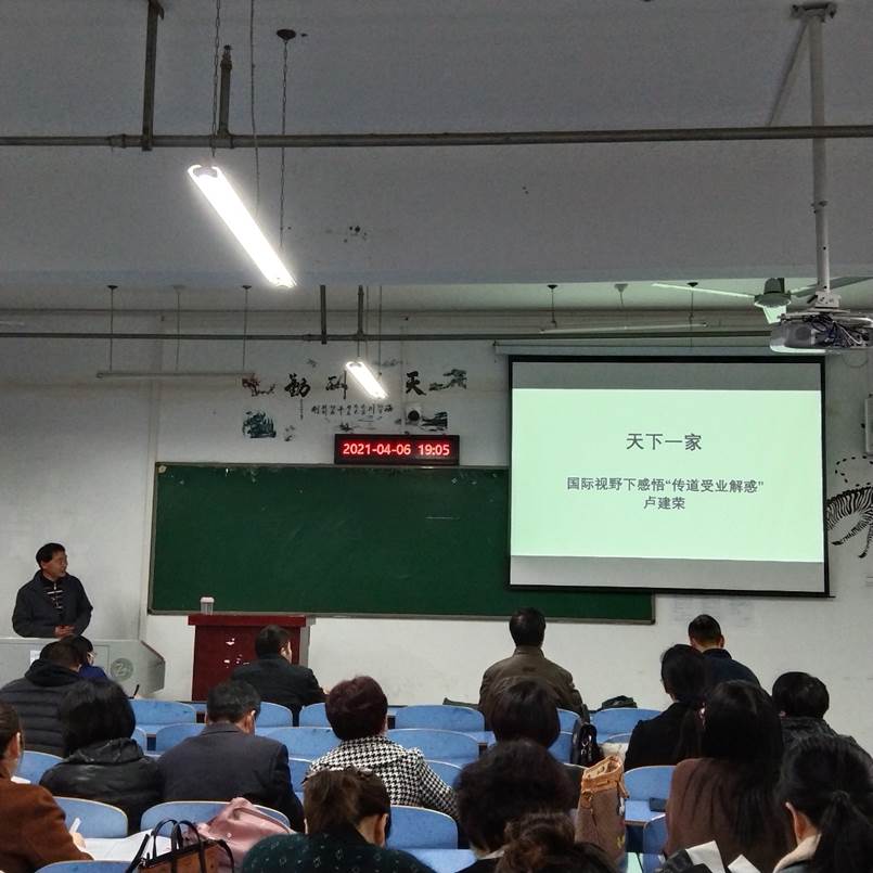 通讯员欧阳钦报道:4月6日晚,william威廉2021年道德建设月系列活动在崇文楼A309启动。公司师德师风优秀教师代表卢建荣老师做了《天下一家—国际视野下感悟“传道授业解惑”》的专题讲座。