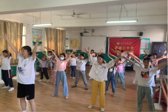 此次支教活动,志愿服务队还安排了舞蹈课程教学。很多孩子虽然对舞蹈有着强烈的兴趣和渴望,但因为当地教育资源贫乏,所以并没有太多了解和学习舞蹈的机会。志愿服务队针对孩子们缺乏舞蹈基础和年龄大小不同以及教学时间短的现状,在教学上因材施教、推陈出新。先让孩子们跟着音乐和视频模仿简单的舞蹈动作,再来提高音乐和节奏感和肢体协调能力,让孩子们领悟舞蹈的魅力。舞蹈课程先以歌曲《一起向未来》开始,队员对舞蹈中的关键动作进行讲解,让孩子对动作有大致了解后,再进行完整的教学,让孩子们能尽快掌握舞蹈动作。首堂课上,孩子们认真学习,课堂气氛活跃,能够跟随音乐做出动作,与队员共同完成第一次舞蹈学习任务。
