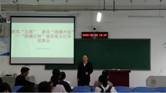 本网讯 欧阳钦报道:5月19日,外院召开“清廉汉师”重点任务部署会,纪检委员曹勇领学了《“清廉汉师”建设工作指引》。