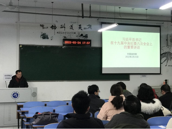 总支纪检委员曹勇老师领学了重要讲话和重要会议精神。总支书记夏金元对贯彻落实的具体措施进行了部署安排,同时要求每一个班子成员及全体党员教师要认真落实外院2022年党风廉政建设工作要点,细致排查廉政风险,制定并扎实执行防控措施;坚持不懈地用习近平新时代中国特色社会主义思想武装头脑、指导实践、推动工作,牢记初心使命,筑牢信仰之基、补足精神之钙、把稳思想之舵,以敬畏之心对待岗位职责,要带头严守政治纪律政治规矩,增强“四个意识”、坚定“四个自信”、做到“两个维护”,永葆自我革命精神。越往后执纪越严,以反腐永远在路上的政治自觉,履行好自己的职责使命。坚持做好常态化疫情防控,打赢本科办学水平评估、师范专业认证、一流专业建设三大攻坚战。