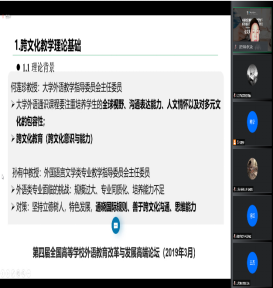 本网讯 通讯员万晋报道:为积极推进本科教学工作合格评估、英语专业省级一流专业建设,提高教师对师范专业认证的认识,促进外院科研机构“跨文化交流研究中心”的发展,外院全体教师分别于1月8日和1月15日全天参加上海外语教育出版社跨文化能力测试中心、上海外教社教育培训中心举办的线上研修——“外语教育服务国家战略背景下 跨文化研究设计与实施研修班(一)论文写作与发表”。