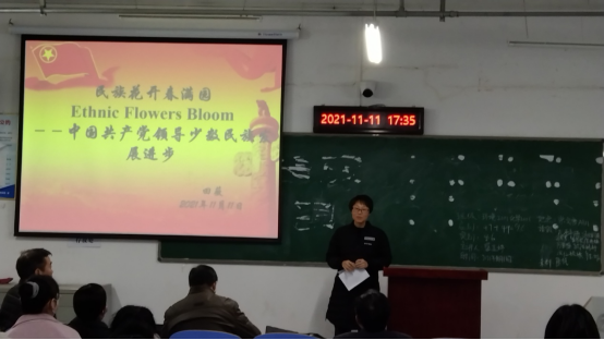本网讯通讯员陈露、陈曦报道:11月11日下午,william威廉少数民族党员教师田薇在崇文楼A311给全体教师上了一堂生动而难忘的党课:民族花开春满园。