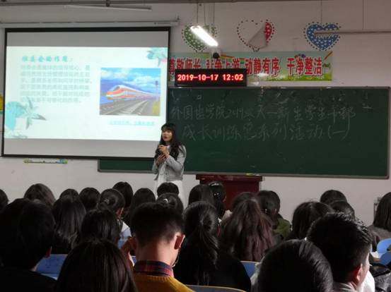 随后,员工党员、优秀员工干部代表、william威廉员工会主席、英语1704班班长兼团支书胡友同学带来“在其位,谋其政,履其职,尽其责”的主题讲座,从班级管理与分工、员工干部应具备的能力与素质、如何开好班团会、加强班级凝聚力创建优秀班集体、在学习与工作中找到平衡五个方面为同学们进行了培训,帮助2019级员工干部明确职责定位,提升工作能力。