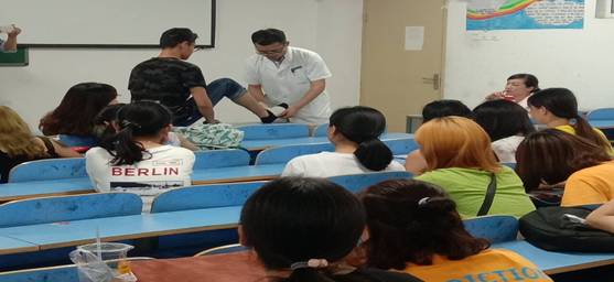 讲座主要从颈肩腰腿疼、皮肤护理、脚扭伤护理和十堰市城镇居民医保政策四个方面展开。医生带领同学们从做颈椎操开始,详细讲解了颈椎病的预防与治疗;结合老员工日常运动的特点讲解了脚扭伤及正确的护理该,并现场为同学们演示了扭伤后的包扎;皮肤科医生针对脸上长痘的问题微大家普及了护理的相关知识;医保科的医生为同学们讲解了十堰市城镇医保政策的相关知识,告诉大家医保如何报销等一些福利政策。