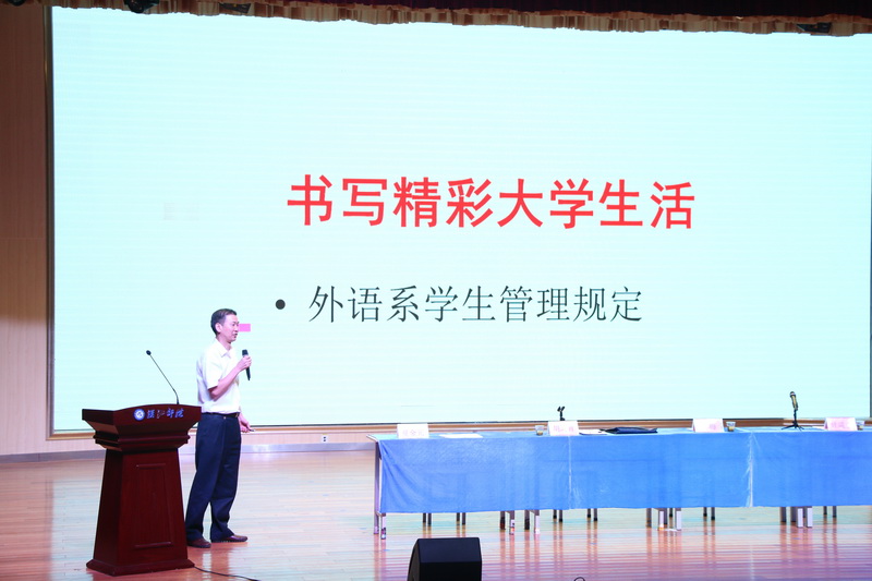 本网讯 通讯员陈丽报道:9月8日晚,外语系在南风剧场召开2016级新生开学典礼暨安全教育大会,系领导班子成员、各辅导员、班主任以及400余名新生参加了本次大会。