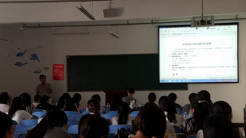 8月31日下午,外语系在文科楼716召开了新学期工作大会,系领导、辅导员及三大组织员工干部、各班班长、副班长和团支书参加了大会。