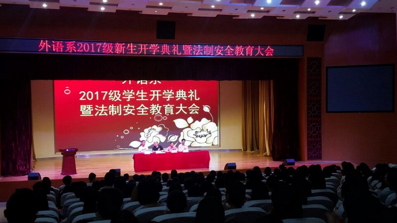 本网讯 通讯员外萱报道:9月8日晚,外语系在南风剧场召开2017级新生开学典礼暨安全教育大会,系领导班子成员、新生辅导员、新生家长代表以及近400名新生参加了本次大会。