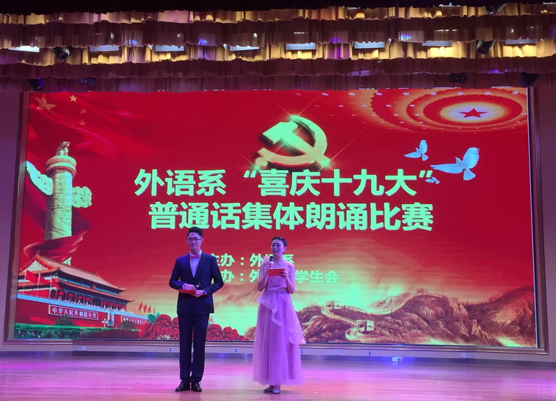 本网讯 通讯员张正青报道:11月26日下午,外语系“喜庆十九大,永远跟党走”普通话集体朗读比赛在南风剧场举行。